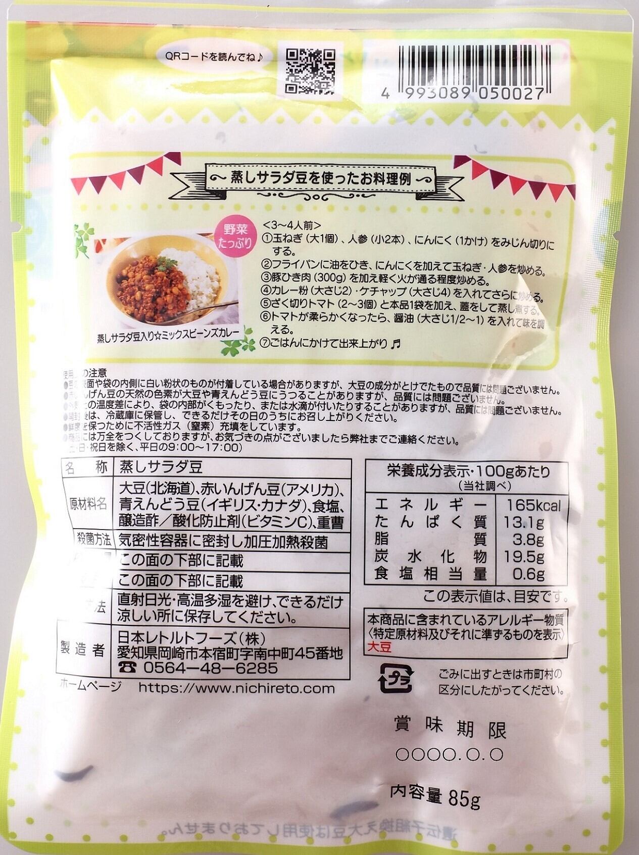 北海道産大豆、青えんどう豆、赤いんげんを彩り良く配合しました。ゆで加工をしない独自の製法により、うまみ成分や大豆の甘み、 栄養を一切逃さずぎゅっと凝縮しています。サラダやカレー、スープなどにご活用いただけます。